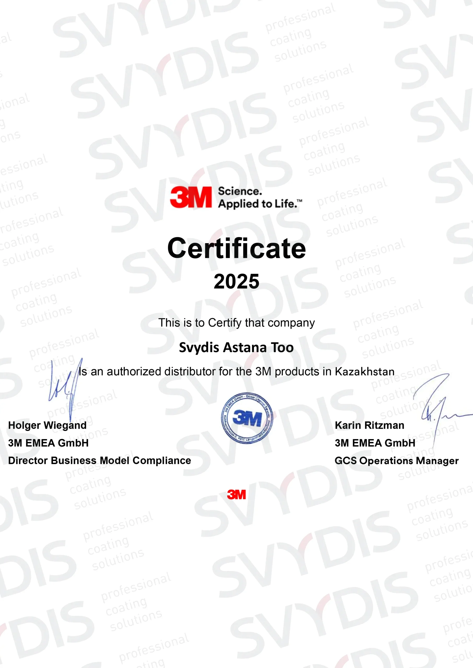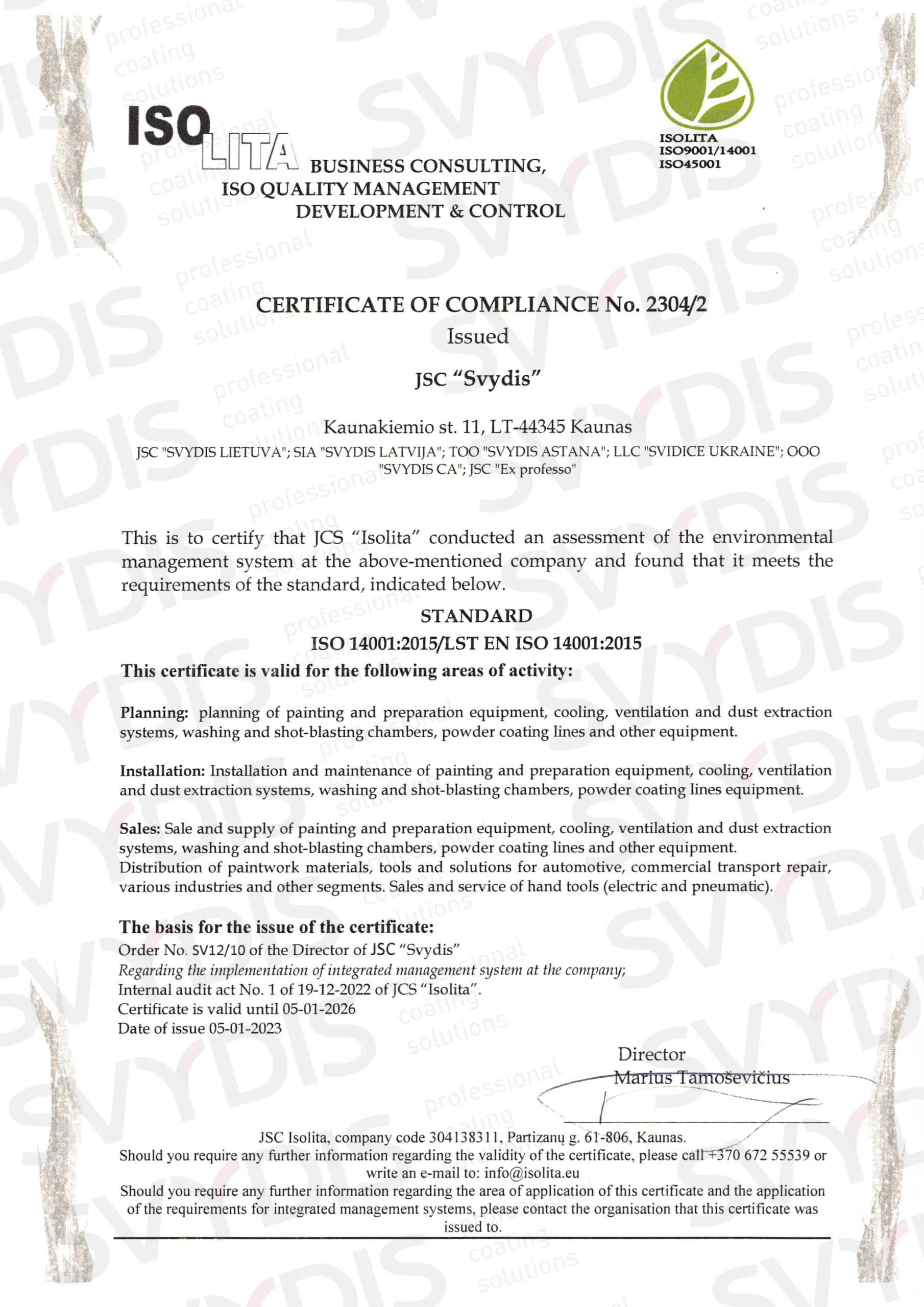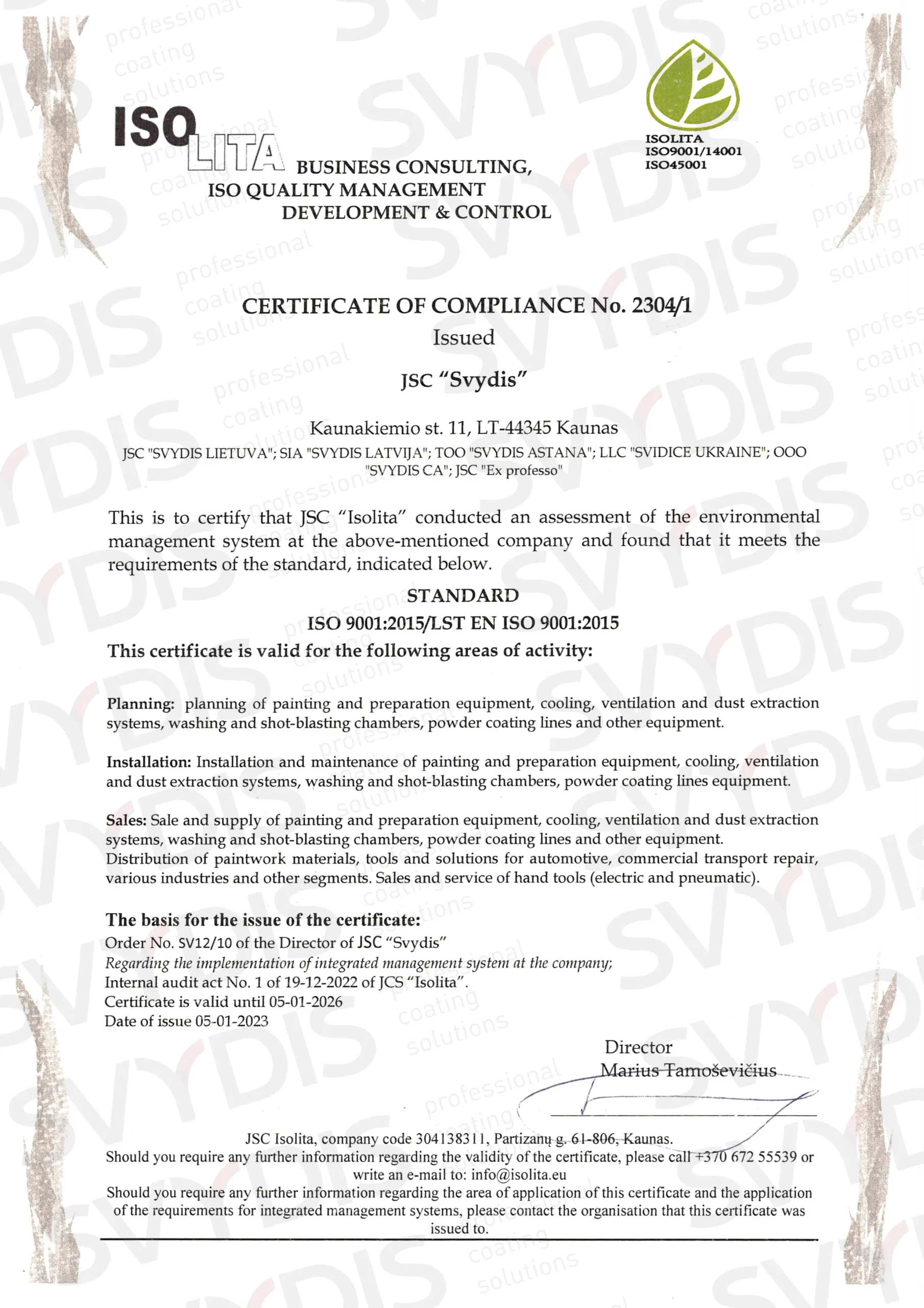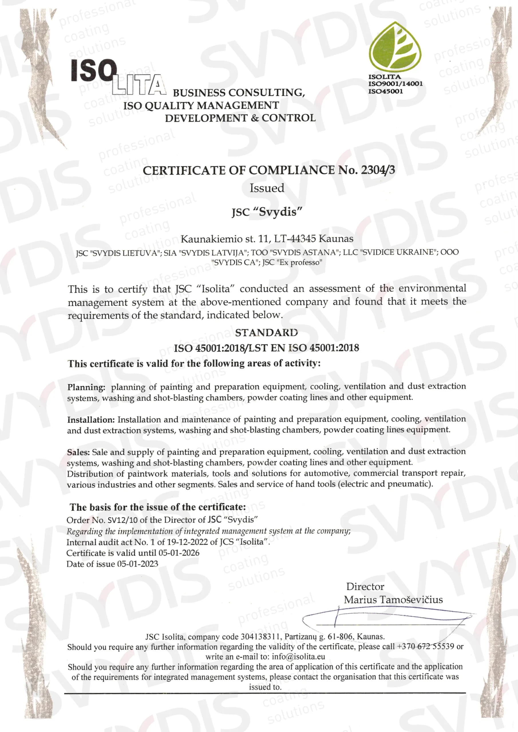 Uzņēmums SVYDIS LATVIJA atbilst augstiem starptautiskajiem kvalitātes un drošības standartiem. Mums ir visi nepieciešamie ISO sertifikāti un citi apliecinoši dokumenti no vadošajiem iekārtu un materiālu ražotājiem.